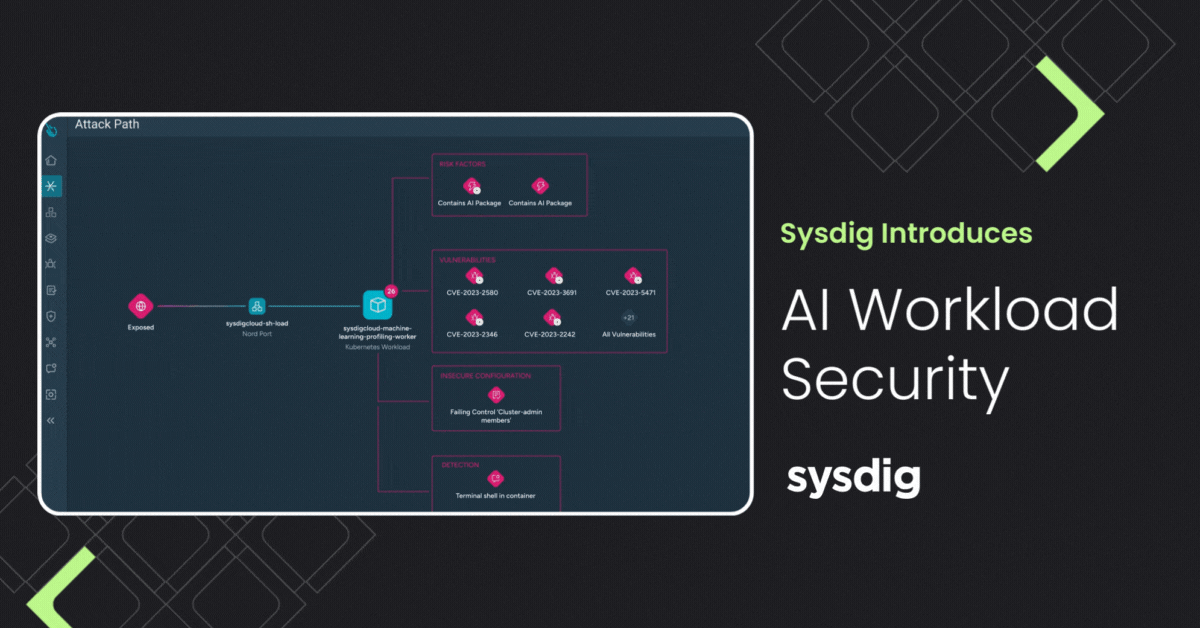 SAN FRANCISCO – April 30, 2024 – Sysdig, the leader in cloud security powered by runtime insights, today announced the launch of AI Workload Security to identify and manage active risk associated with AI environments. The newest addition to the company’s cloud-native application protection platform (CNAPP) is designed to help security teams see and understand their AI environments, identify suspicious activity on workloads that contain AI packages, and fix issues fast.